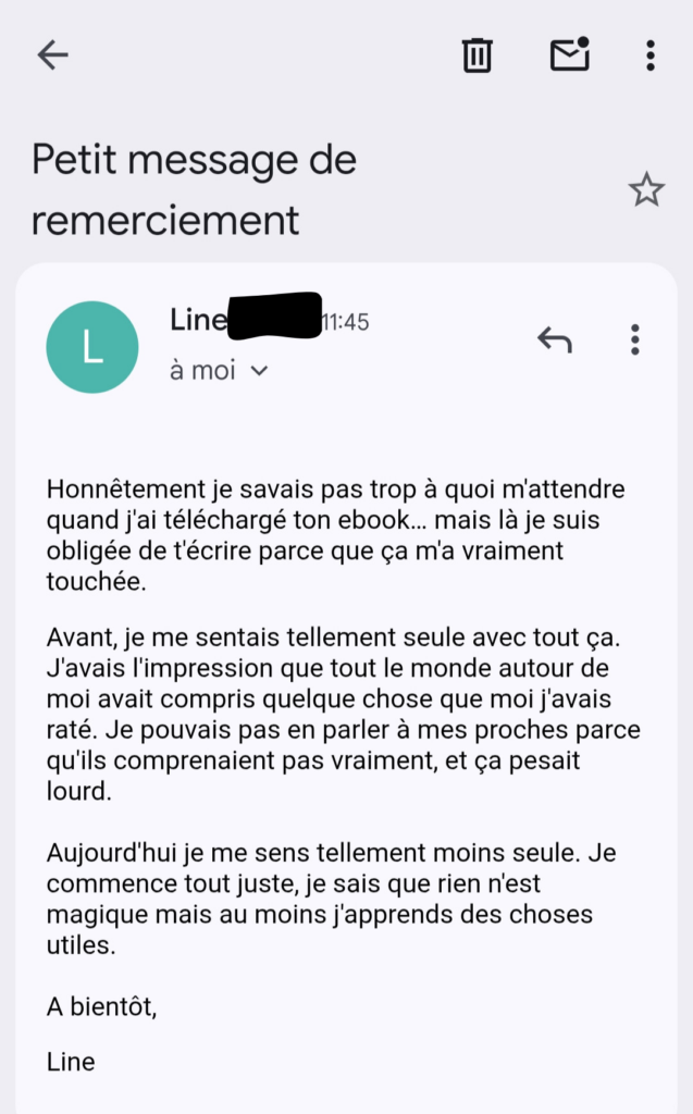 L’accompagnement permet d’aller plus en profondeur, d’avancer plus vite et surtout de ne pas rester seule face aux difficultés.
